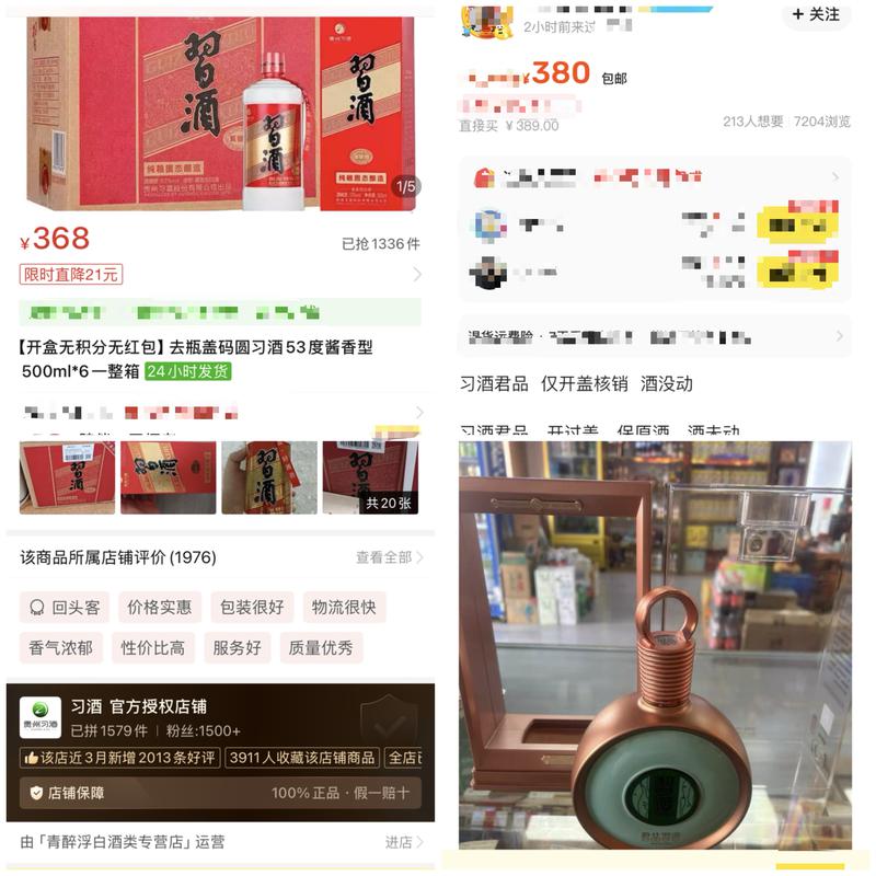 今年8月,线上交易平台售卖的开盖核销红包习酒相关产品。店铺截图