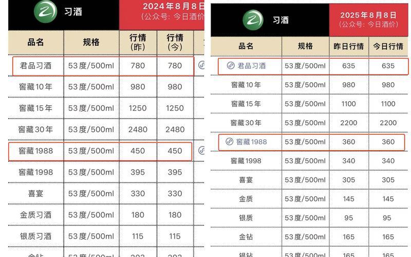 记者注意到,习酒价格倒挂现象仍未缓解,其高端产品君品习酒已“失守”千元价格带。据中国酒业协会联合毕马威发布的《2025中国白酒中期研究报告》显示,近五年白酒T9品牌主要产品价格变化中,君品习酒批价累计跌幅高达39.82%。此外,其核心大单品窖藏1988批价(据8月11日酒价数据)一年来已经下跌近100元。
